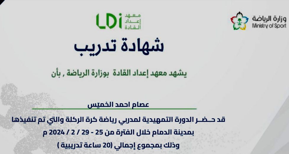 حصل المدرب الوطني الكابتن عصام أحمد الخميّس، على شهادة تدريبية لمدربي رياضة كرة الركلة، حيث تعتبر الدفعة الأولى بعد اعتماد الرياضة رسمياً بالاتحاد السعودي وسيكون الخميّس مدرباً رسمياً للعبة كورة الركلة .